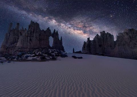 A world where, at nightfall, the Milky Way illuminates the caravans of hunchbacked beasts with endless, thin legs that tumble down the pink sand dunes.